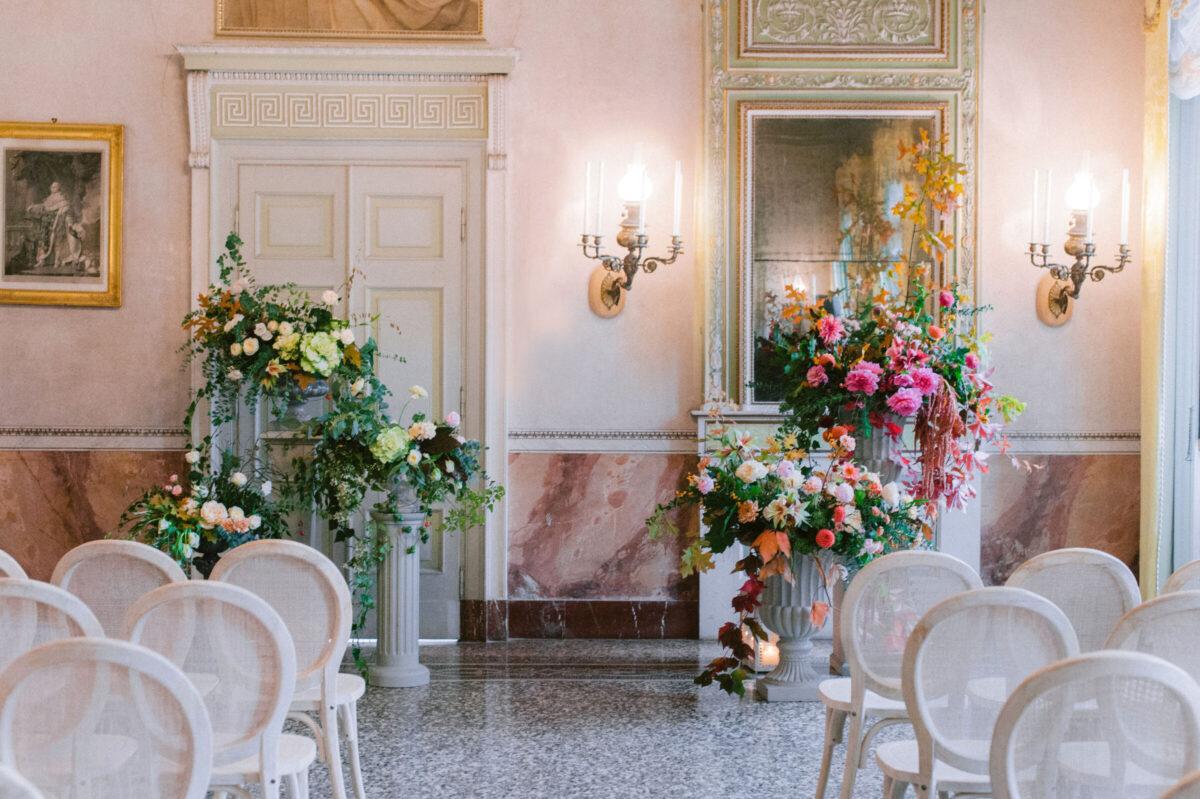 The original interior of this villa with frescoes, marble floors and pastel colours does not disappoint. For small groups this space can be used for dining, or for larger groups it makes a perfect after party dance floor.